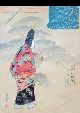 Na przykład ten przepiękny barwny drzeworyt, ozdobiony srebrnym pudrem i tłoczeniami, przedstawiający aktora teatru No (klasycznego teatru japońskiego), w charakterystycznej białej masce na twarzy oraz w kunsztownym, bogato zdobionym kostiumie. Postać ujęta jest nietypowo: niemal z tyłu, w półobrocie, w ruchu. Aktor nie pozuje, jak w większości znanych nam z drzeworytu japońskiego, popularnych przedstawień aktorów Kabuki - uchwycony został bezpośrednio w akcji, na scenie. Widoczne w tle, oszczędnie zaznaczone elementy dachu świątyni buddyjskiej, motyw sosny (symbolu długiego życia oraz szczęścia i powodzenia), wachlarz w dłoni aktora, ornamentyka kimona, to - podobnie jak biała maska - nieodłączne symbole teatru No.